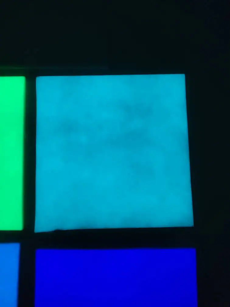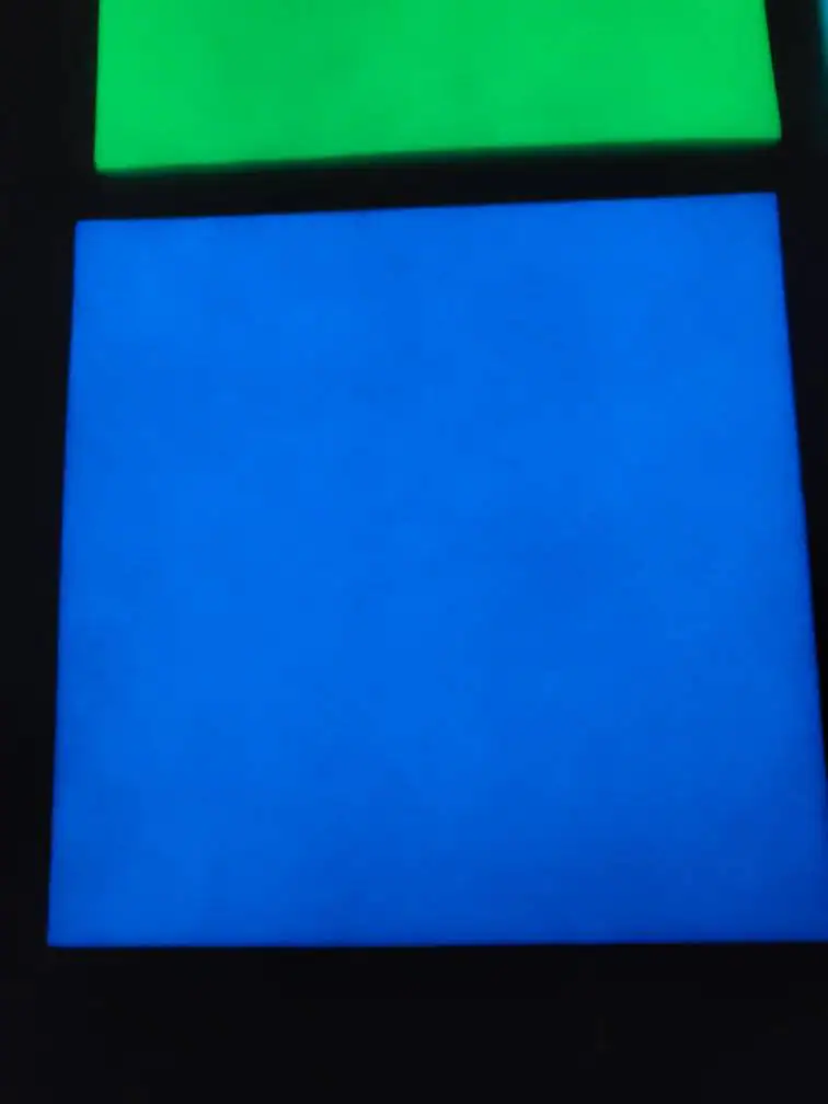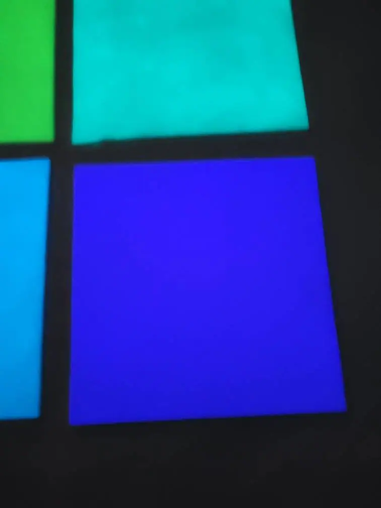 Blue is very pretty but it is the least luminescent. It has a cool glow in a rich color even though it’s not as bright. One advantage is there is very little discoloration from the original White. (Top left sheet in group image). This color does best with UV light (black light).