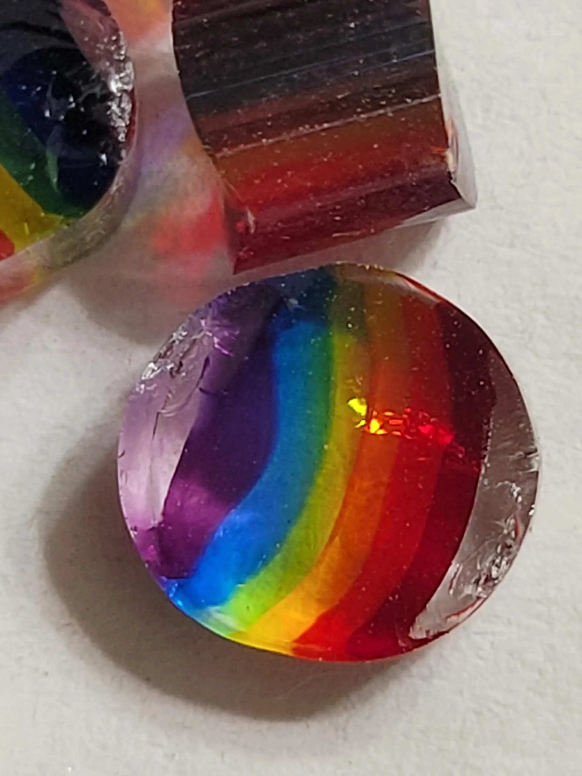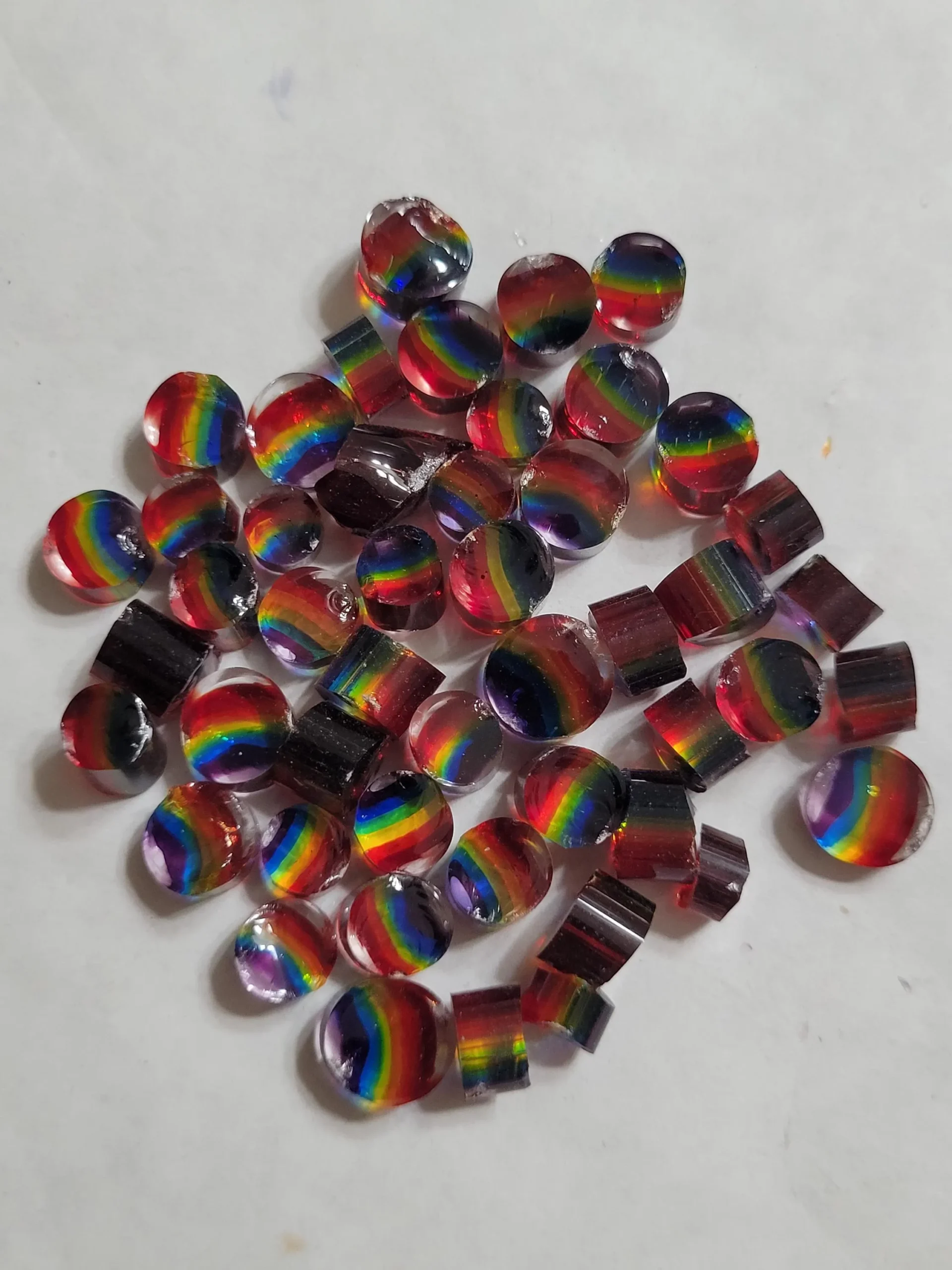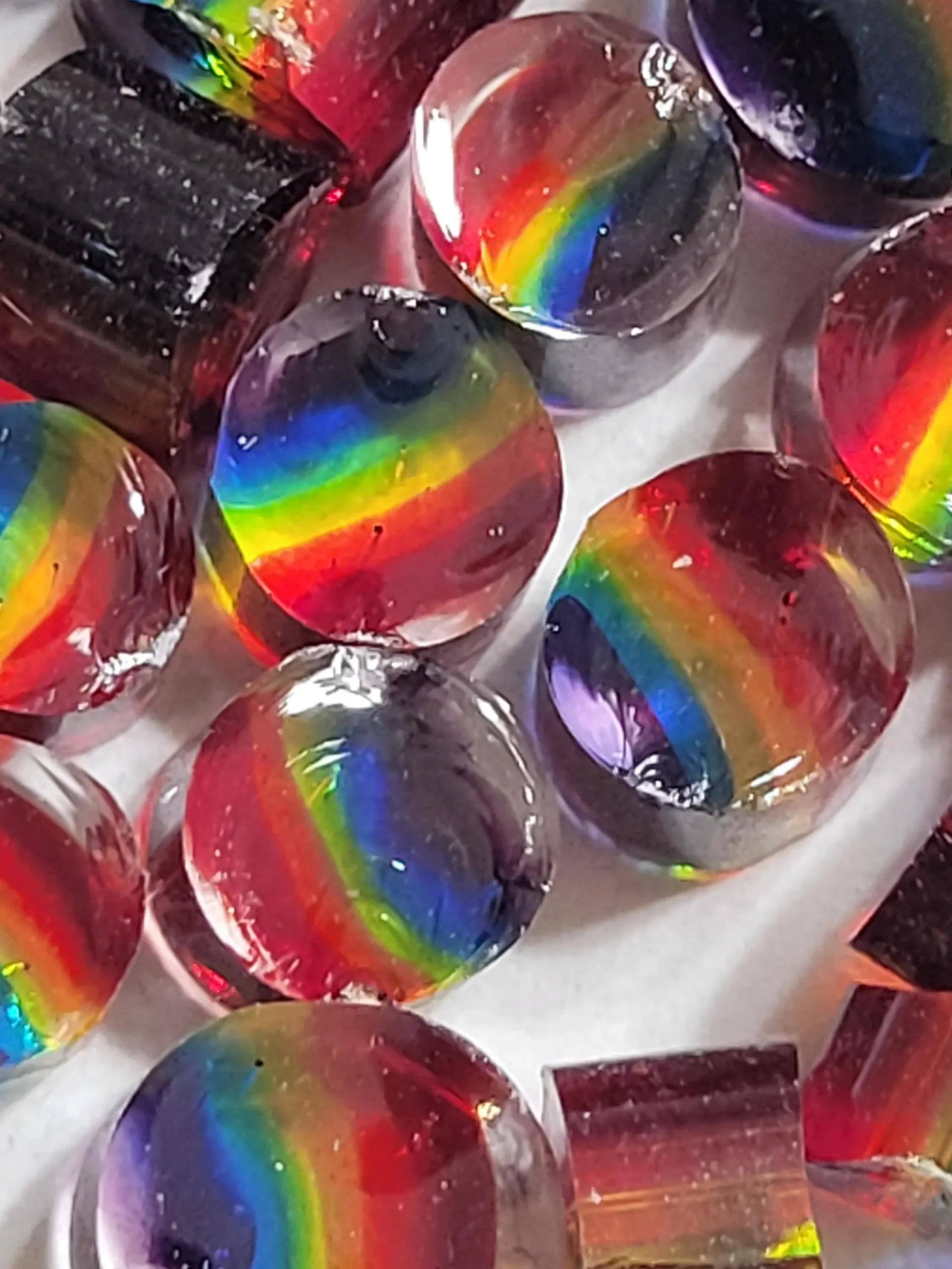 Beautiful rainbow murrini made from transparent Bullseye 90 coe glass. Size varies from about 4mm wide (across cross-section, or diameter) to about 8mm wide and from 3mm high to 6mm high. All hand cut from cane we made. Each order contains 30 grams (1oz).