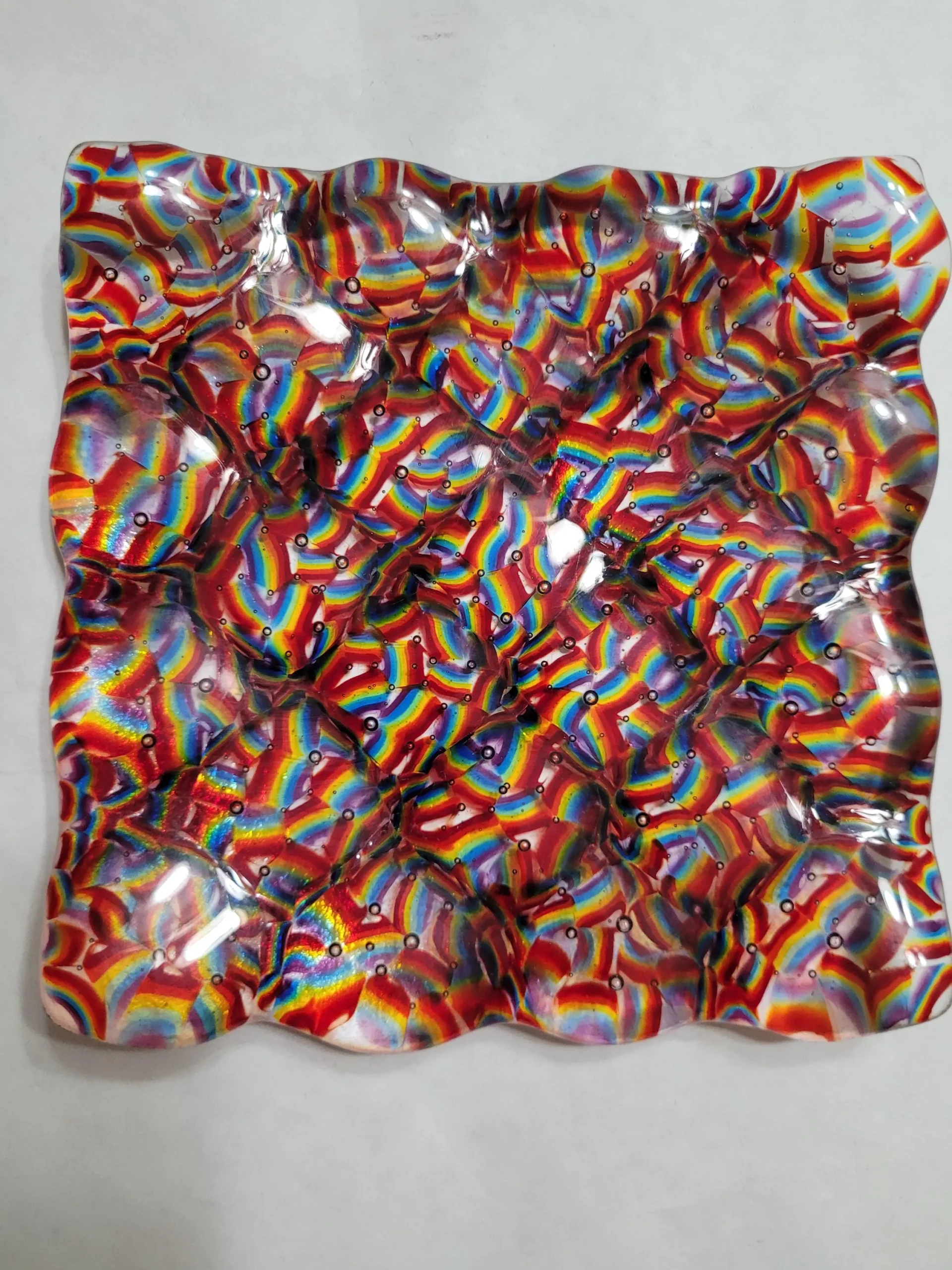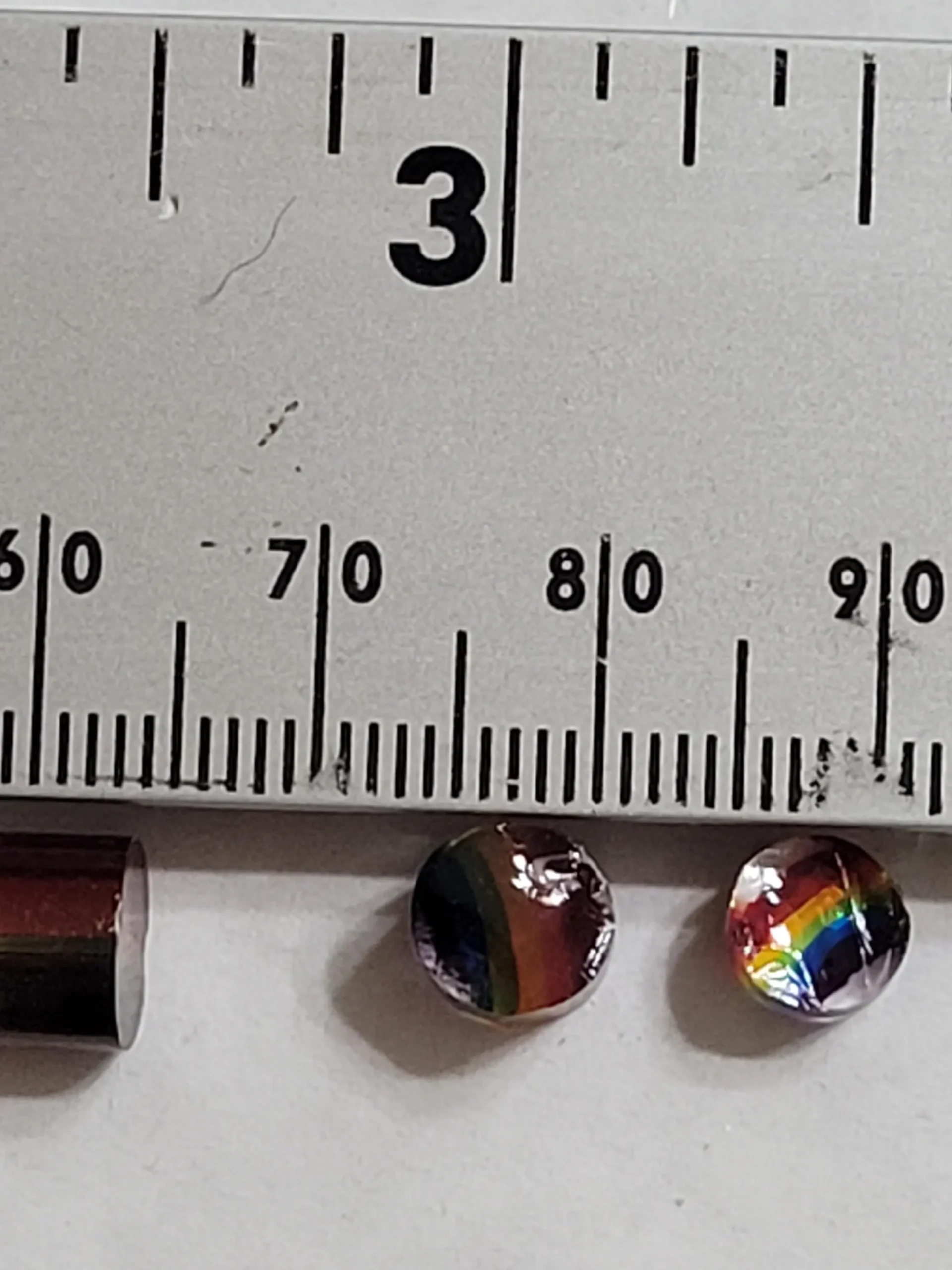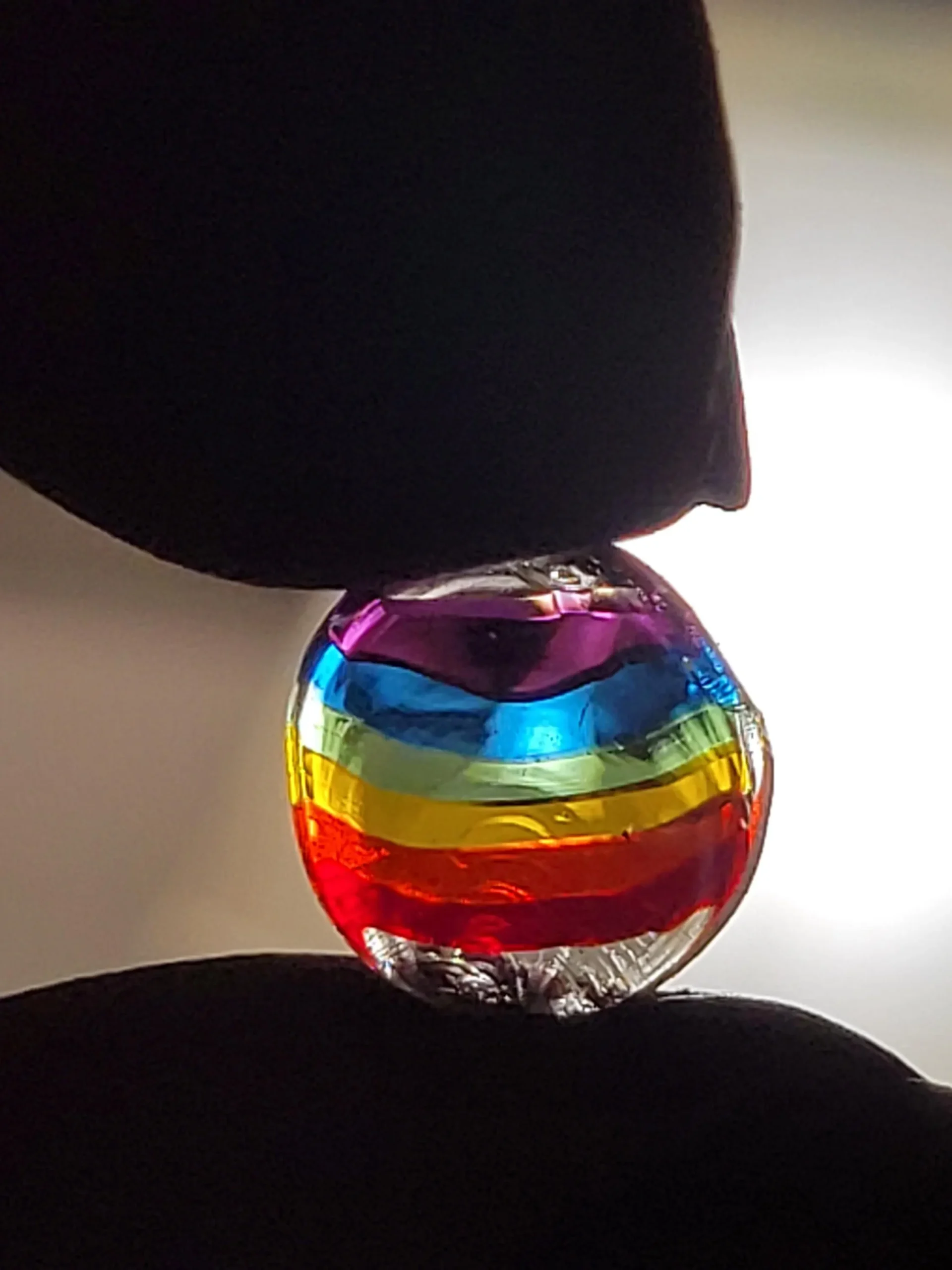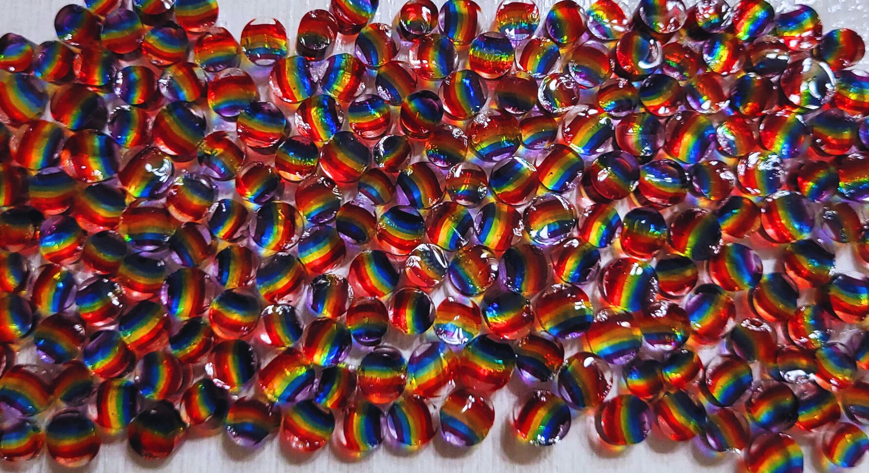 Beautiful rainbow murrini made from transparent Bullseye 90 coe glass. Size varies from about 4mm wide (across cross-section, or diameter) to about 8mm wide and from 3mm high to 6mm high. All hand cut from cane we made. Each order contains 30 grams (1oz).