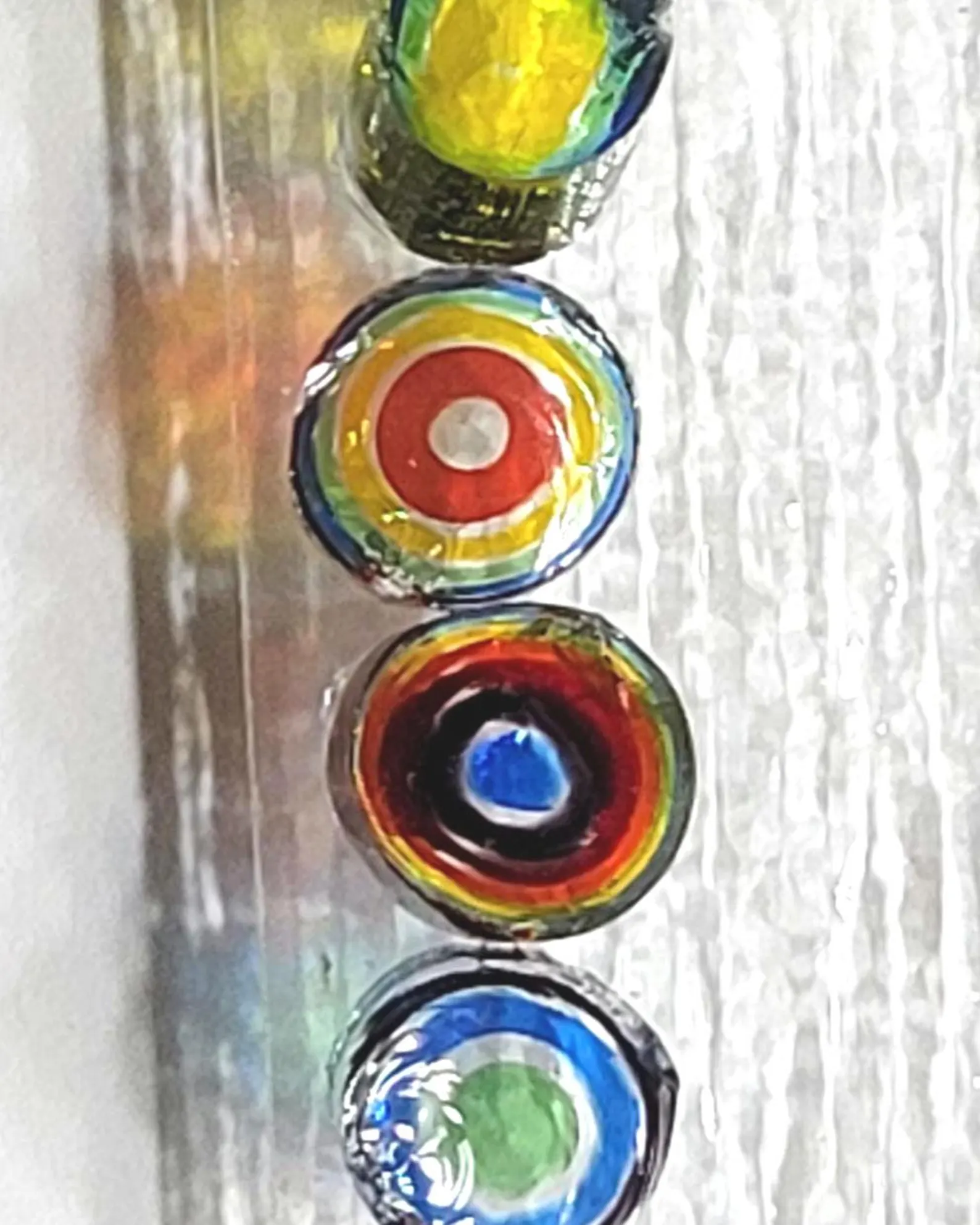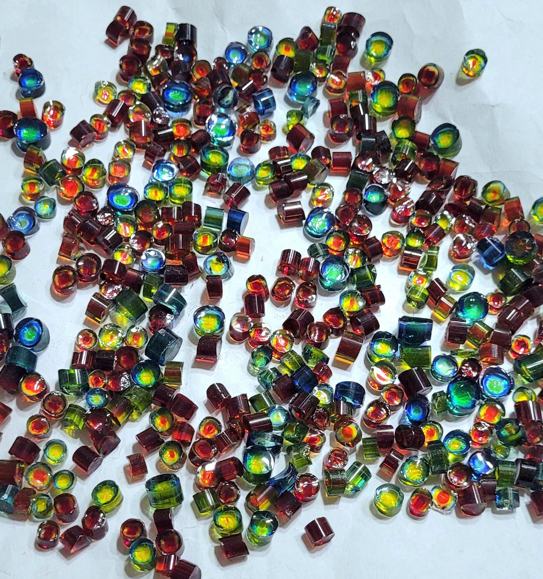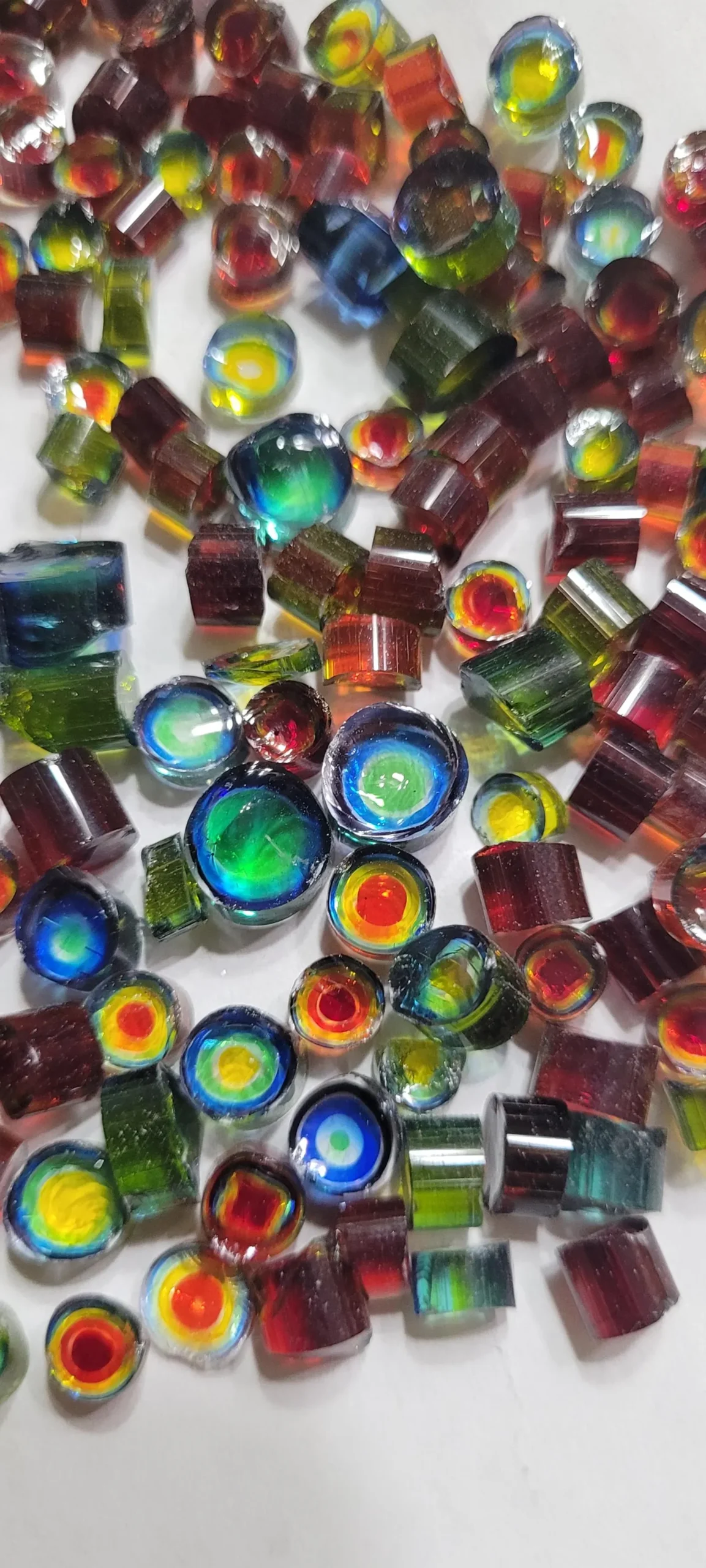 Our multicolored “ring” style murrini. Made in rainbow colors from transparent Bullseye 90 coe glass. Size varies from about 4mm wide (across cross-section, or diameter) to about 7mm wide and from 3mm high to 6mm high. one ounce has about 60 to 75 pieces. These have some trending towards the more red to yellow, some that are more green to purple, and some with all the colors!! Wonderful variety of colorful joyness crossing the entire spectrum. All hand cut from cane we made. Each order contains about 30 grams (1oz). We can give better deals on orders over 5 OZ, contact us for more information.